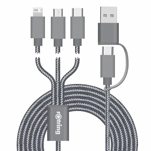 This sleek braided 3-in-1 charging cable covers all Smart Phones on the market. Featuring a Type-C input and MicroUSB, Type-C USB, and 8-pin style output connectors! Connect Reach supports simultaneous charging for 3 devices, all combined in one power cord. This extra-long, durable, and stylish cable will charge all your devices while you are on the go or at home.