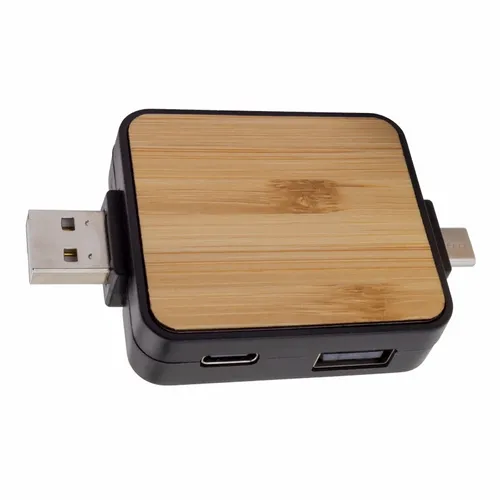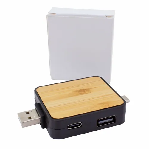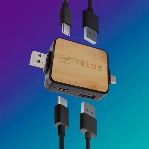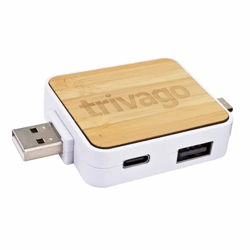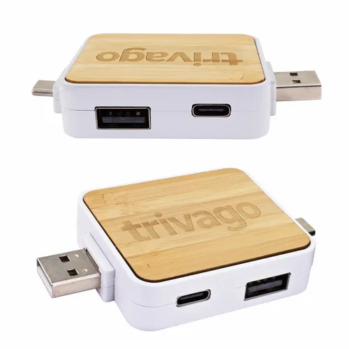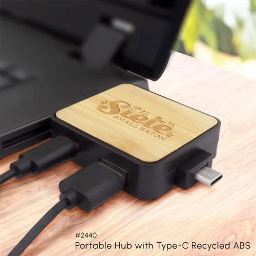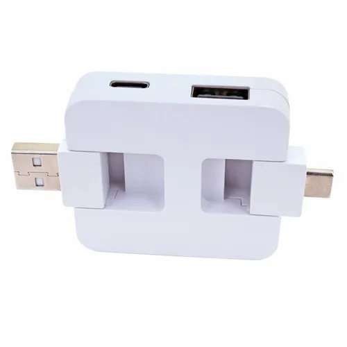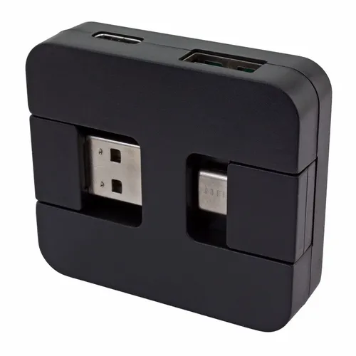 A compact and portable USB hub with two Type-C ports (USB-C) and two standard USB ports (USB-A). Made with recycled ABS (Acrylonitrile Butadiene Styrene).