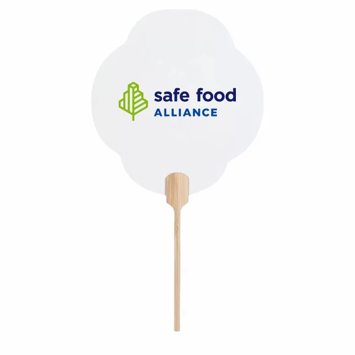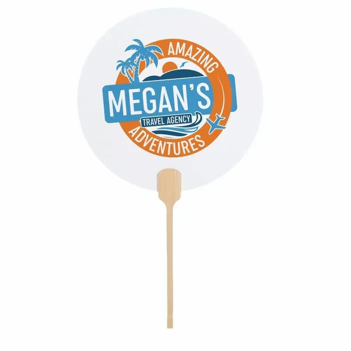 A custom wedding hand fan is a foldable handheld fan made with an 8-inch cardboard surface and a 6-inch bamboo handle designed in a smooth half-circle style. Available in shapes such as circular, hourglass, petal, and ellipse, these fans come in a default white color with a gray-white handle, making them versatile for personalization and decoration.