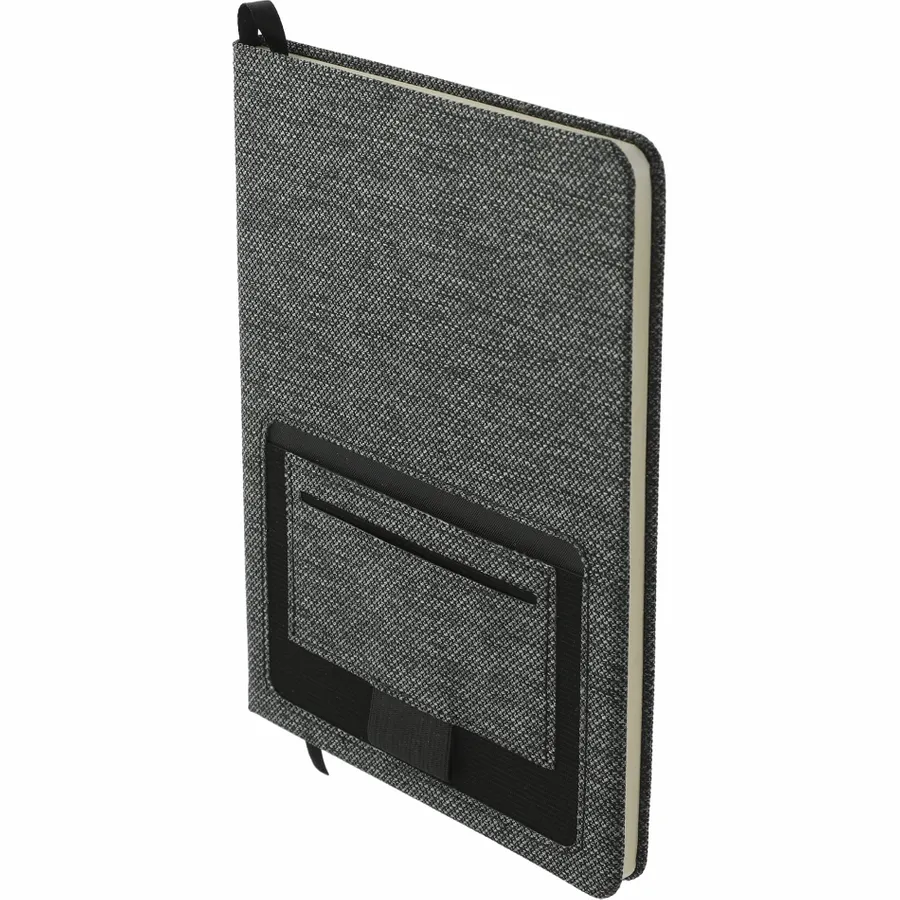 The 5.5” x 8.5” FSC Mix Vila RPET Bound Notebook features a hard, 100% Recycled PET cover with built in front pocket organization to hold a smartphone or business cards. Includes 80 sheets of cream lined FSC Mix paper, black ribbon page marker and black elastic pen loop. By choosing this notebook, youre making a positive impact on the environment, as one percent of sales are donated to environmental nonprofits through a partnership with 1% For The Planet.