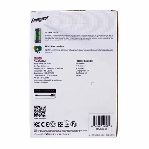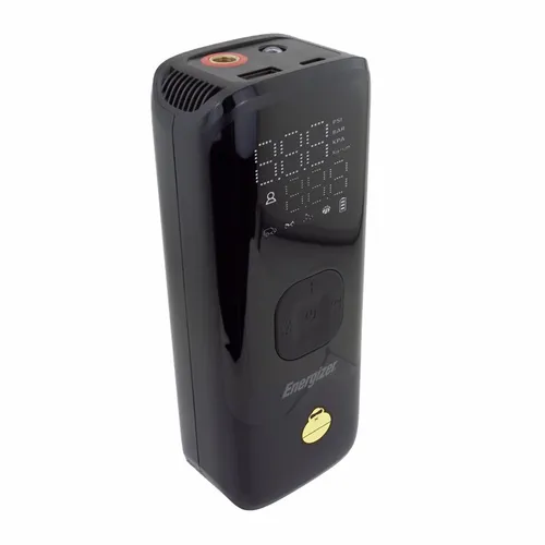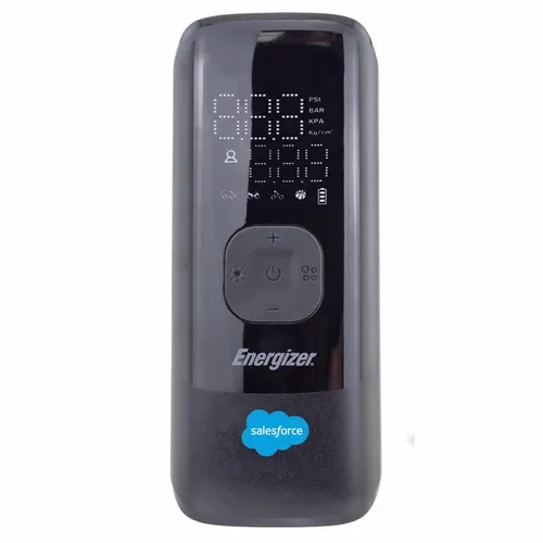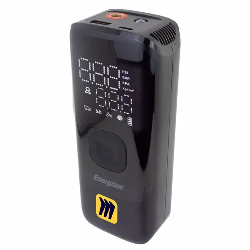 A portable and rechargeable electric tire pump with a large easy to view LED display. It has five inflation modes: automotive, motorcycle, and bicycle tires as well as a setting for sports balls. It also functions as a power bank with a USB output port located on top. Recharge the air pump's built-in lithium battery via its Type-C input port. It is packaged with a compact attachable air hose and a Type-C cable. AC wall adapter not included.