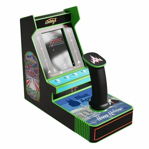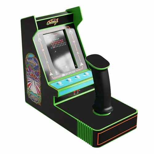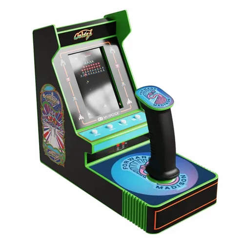 High-resolution 3.5" full-color vertical display, featuring eye-catching artwork inspired by the nostalgic Galaga arcade cabinet!