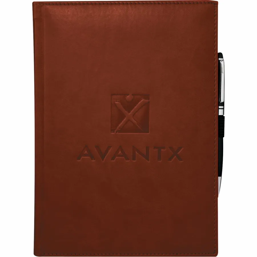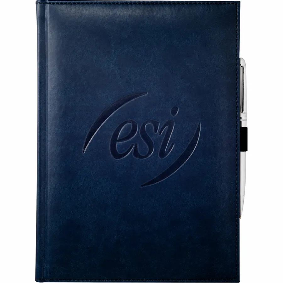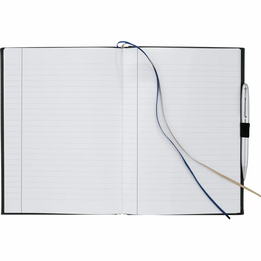 The 7 x 10 FSC Mix Pedova™ Large Bound Journal is a hardcover bound journal featuring Italian UltraHyde construction. It contains 125 sheets of FSC Mix white lined paper with built-in ribbon page markers to help hold your place between uses. This stylish notebook also features an elastic pen loop, with pens available to order separately.
