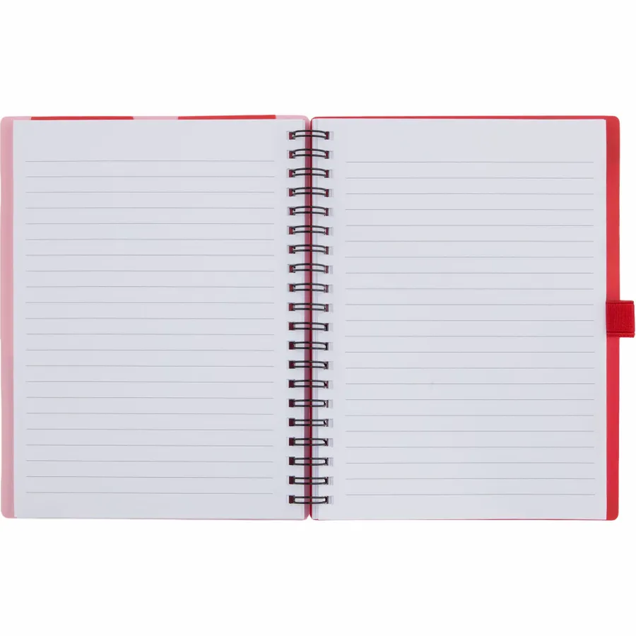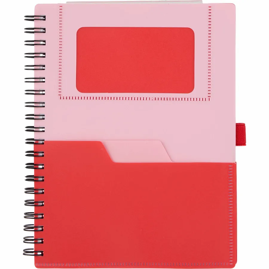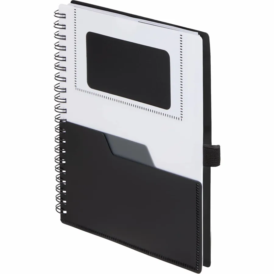 The 5 x 7 FSC Recycled Stash Spiral Notebook keeps notes tidy and accessible. Its durable 100% recycled PP cover includes two front pockets and a business card slot, plus a matching pen loop. The spiral binding lays flat for comfortable writing across 80 sheets of FSC recycled paper—ideal for meetings, classes, or daily journals. By choosing this notebook, youre making a positive impact on the environment, as one percent of sales are donated to environmental nonprofits through a partnership with 1% For The Planet.
