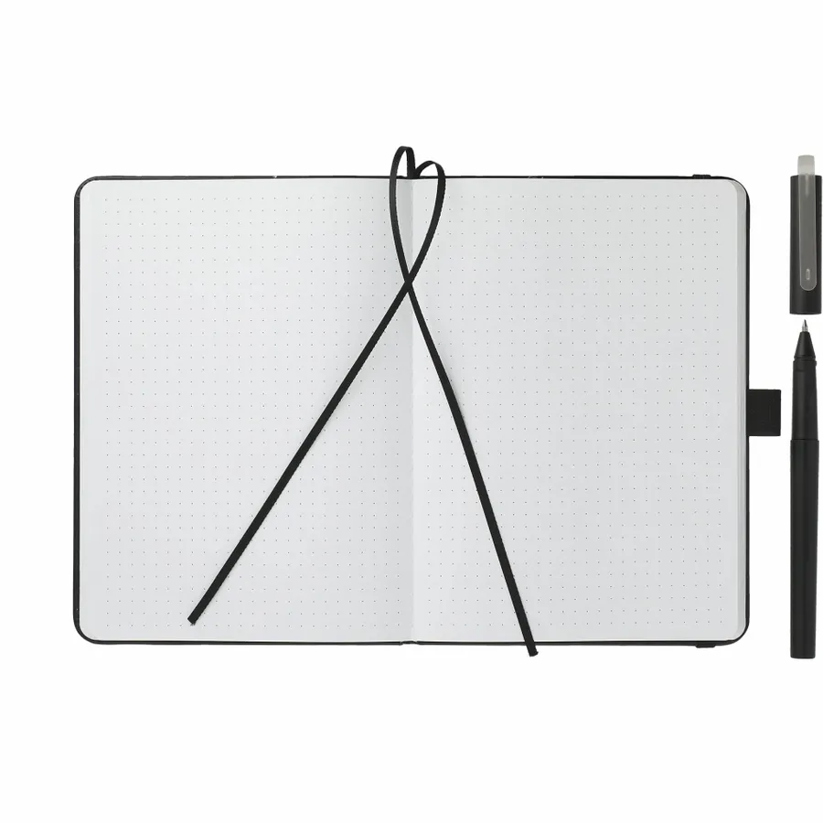 The 5 x 7 Recycled Bulleting Notebook with Pen Set features a recycled PU cover. 40% recycled post-consumer polyester, 18% recycled pre-consumer polyurethane, 18% polyurethane, 14% calcium carbonate. Includes 80 sheets of dotted white paper, two black ribbon markers, black pen loop and elastic closure. This notebook comes with a RPET pen with black ink. Through a partnership with 1% For The Planet, one percent of sales of all EcoSmart products are donated to environmental nonprofits. Note that pens are packed separately.