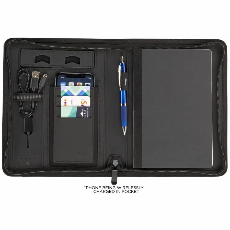 The Stockton 5000 mAh Wireless Charging Journal with FSC Mix Paper is as practical as it is attractive. With a built-in 5000 mAh powerbank, this refillable journal offers wireless-charging capability, too. It supports wireless charging up to 1A for: iPhone 8/8Plus/X/XS/XS Max/XR/11/11 Pro/11 Pro Max *Samsung Galaxy Note5/S6/S6 Edge/S6 Edge+/S7/S7 Edge/S8/S8+/S9/S9+/Note 9 * Google Nexus 5/6/7 * HTC Droid DNA, 8X * LG G3/G4, Lucid 2/3 * Nokia Lumia 920/930 *. The powerbank includes a USB port for wired charging. The Stocktons zip-closure folio features a phone pocket, built-in phone stand, and elastic pen loop, while 5.5 X 8.5 bound notebook includes 64 sheets of cream-colored FSC Mix lined paper. This journal ships in a one-piece FSC-certified gift box.