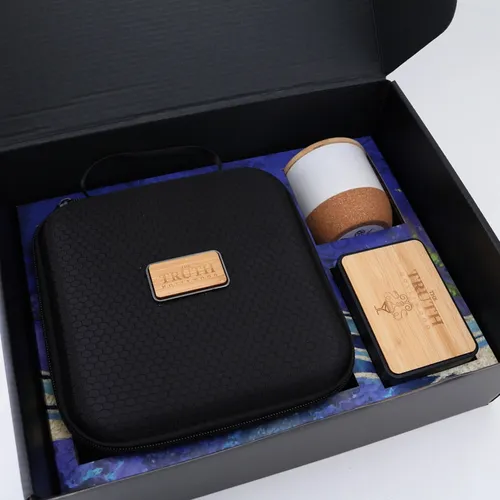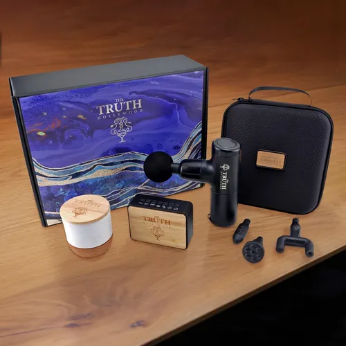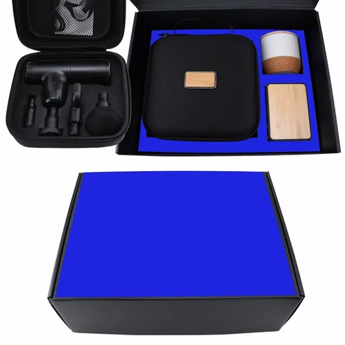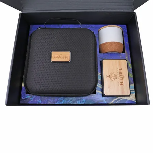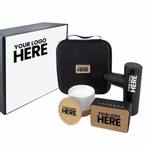 The Calm and Relax Cozy Kit 3-piece set comes with our Sound Machine, Massage Gun with Zip Case Packaging, and candle. It's a great way to give the gift of self-care and wellness to a team that works hard throughout the year. Includes: #2085Z Massage Gun With Zip Case Packaging, #2061 Sound Machine, candle with an engraved bamboo lid, and Full-color box cover decal (note: print decoration is not printed directly on the box). Prop 65 pass for #2085Z Massage Gun & #2061 Sound Machine.