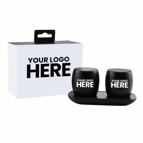 Portable stereo surround sound speakers that come with a beautiful custom full-color sleeve for maximum brand exposure. Simply pair this stylish pair of wireless Speakers to each other, and then to your smartphone to enjoy the sound of your favorite music and movies all around you! You can also loan one to a friend as the Nano Twins can be used independently as well!