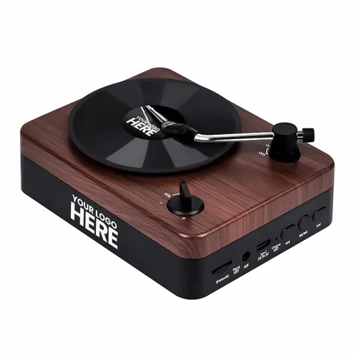 The wireless Turntable Speaker adopts a classic retro design, combined with perfect sound quality to bring you an excellent audio experience. The Turntable Speaker is packaged in a gift box and can be decorated with a custom decal on the faux vinyl record and your logo printed in full color on the side of the Turntable Speaker.